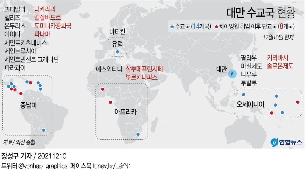 이러한 이유로 대만의 수교국은 남태평양의 팔라우, 마셜제도 등 전세계를 통틀어 15개 밖에 되지 않는다.