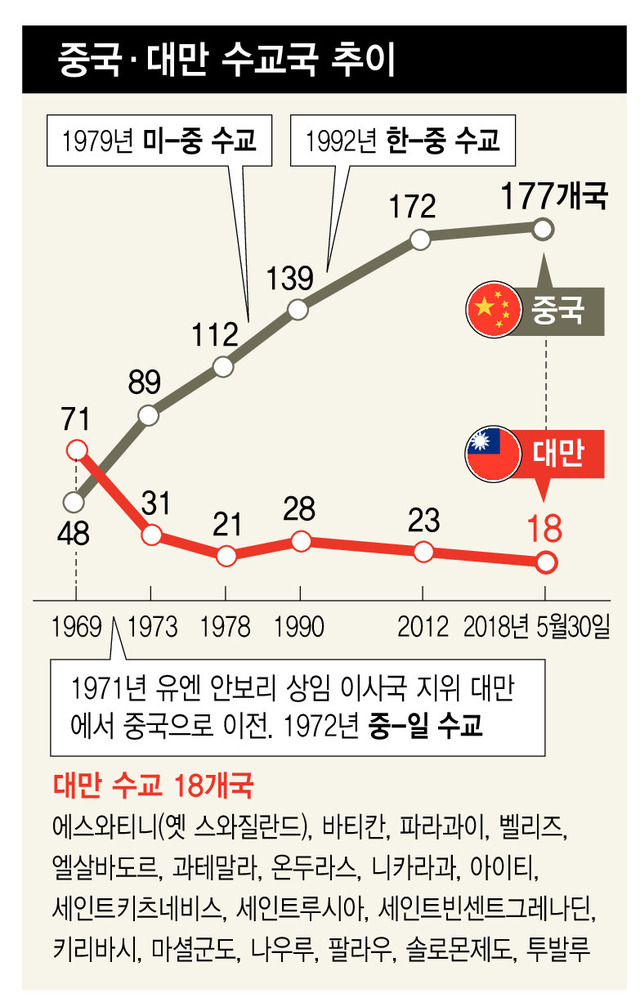 일본은 1972년, 미국은 1979년에 대만과 단교했으며 주요국가 중 대한민국만이 꽤 오랜기간 관계를 유지하다 1992년 9월 23일 단교 후 한국 내 대만 대사관의 대사관 열쇠를 돌려받게 된다.